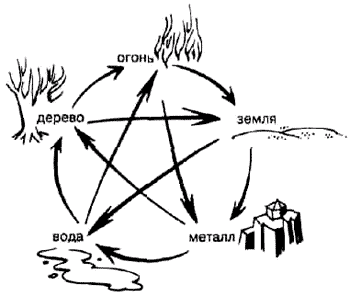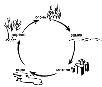 Пять элементов порождают и уничтожают друг друга в непрерывном цикле, когда один элемент взаимодействует с другим позитивным или негативным образом. Эти пять элементов порождают и в то же время уничтожают друг друга в непрерывных циклах - цикле созидания (рис.1)и цикле разрушения (рис.2).